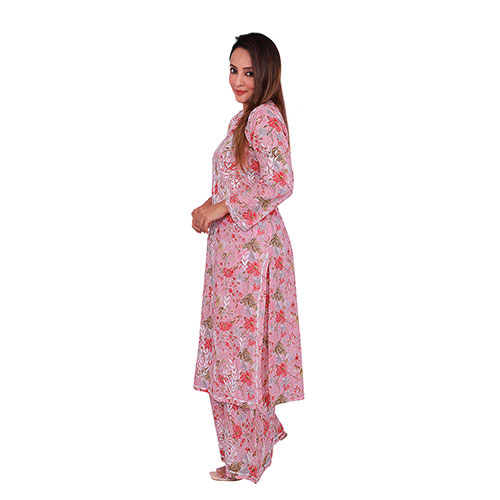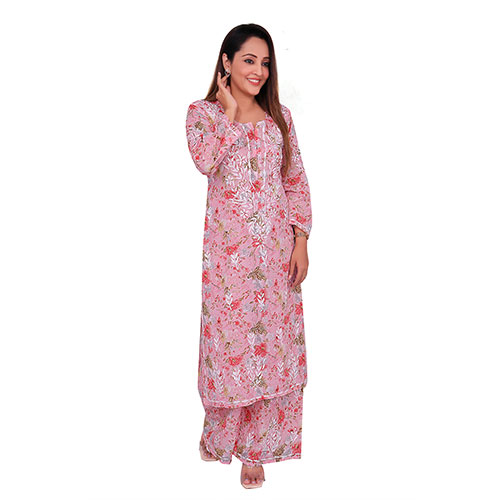 Indian Kurti for Women Floral Embroidered Chikankari Straight Kurta with Palazzo, Pink, Cotton Blend