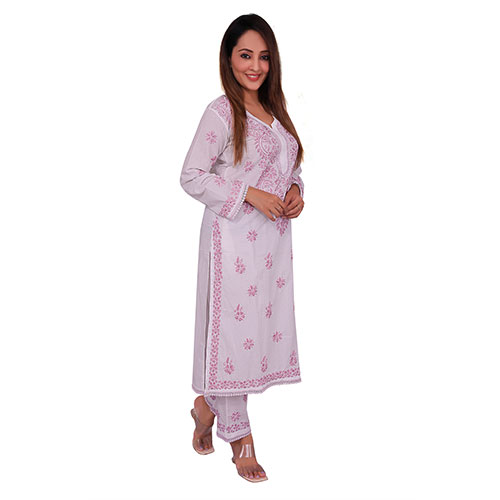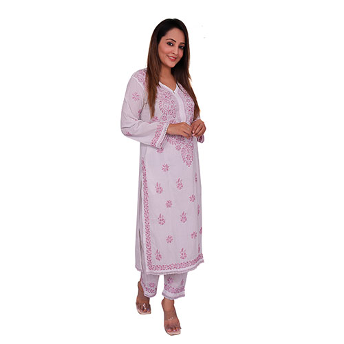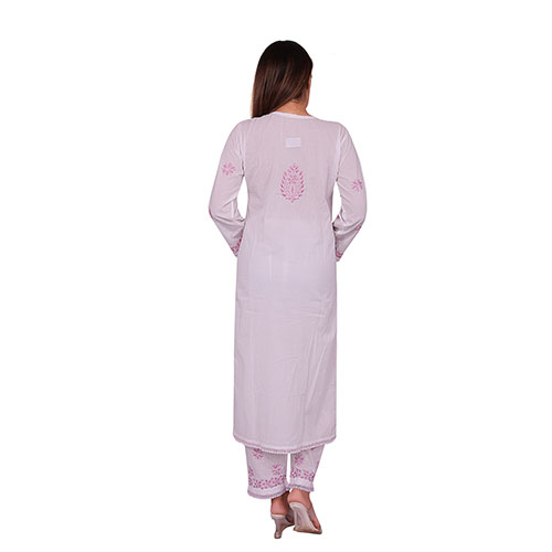 Indian Kurti for Women Soft Mulmul Cotton Embroidered Kurti and Pajama Set, White Pink
