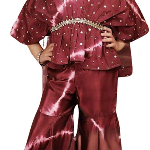 This elegant maroon sharara set from Traditional Threads is perfect for young girls. Made of pure rayon in a solid gold print, the red wine colored kaftan top and sharara bottom piece are designed for comfort and grace. Adorned with stone work and lace at waist, this ethnically inspired outfit gives a polished look suitable for festivities and everyday wear. The loose fit of the kurta paired with the comfortable sharara pants allow freedom of movement while celebrating traditional craftsmanship. Girls will feel proud wearing this handcrafted set that can be paired with flats or heels for any special occasion on your calendar.