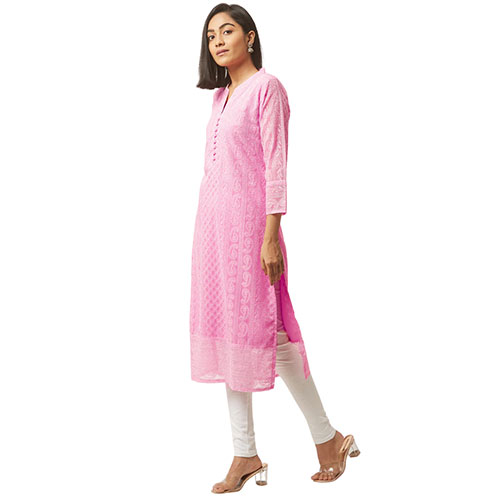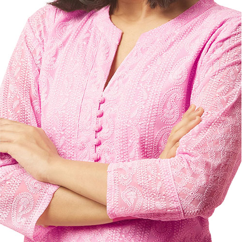 This elegant pink kurta from Traditional Threads features exquisite Lucknowi chikankari embroidery. The paisley motifs are intricately hand-stitched onto lightweight georgette fabric, creating an airy yet luxurious garment. The attached lining adds comfort and structure without compromising the kurta's flowy silhouette. Perfect for warm weather, this kurta will keep you cool and comfortable while delighting observers with its fine details. Skilled artisans have passed the heirloom craft of chikankari embroidery down through generations, ensuring techniques stay vibrant despite enduring for centuries. Wear this traditional kurta to social gatherings or everyday occasions to showcase both classic Indian style and support time-honored artisanal skills. Hand wash is recommended for careful care.