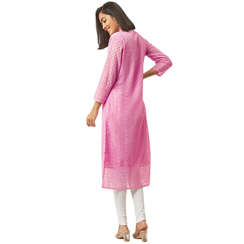 Paisley Embroidered Georgette Kurta for Women, Light Pink, Lucknowi Chikankari Style