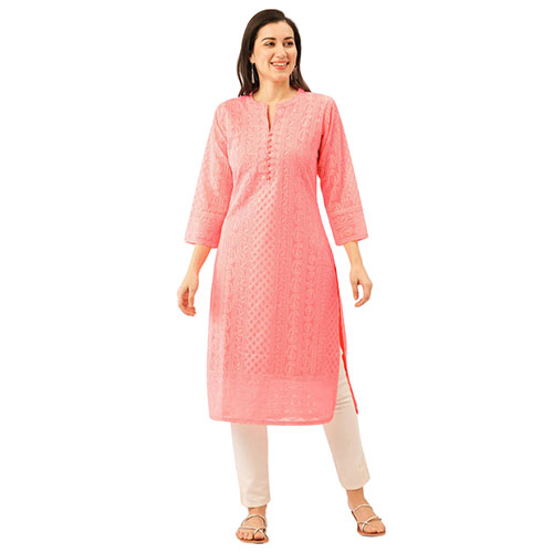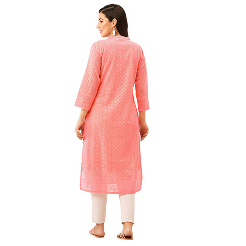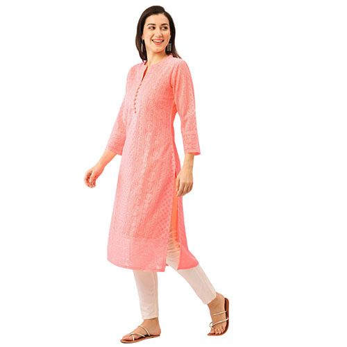 This exquisite kurta from Traditional Threads is perfect for warm weather wear. Crafted from lightweight peach georgette fabric, it features intricate Lucknowi chikankari embroidery in a beautiful paisley pattern. The kurta comes with attached lining for comfort and modesty, and is straight from the workshops of Lucknow where this heirloom art form has been passed through generations. The sublime hand-stitched embroidery is combined with lush yet breathable georgette, making this kurta both comfortable and stylish to wear. Suitable for all occasions from casual daywear to festive events, this kurta will stand out in any setting. Traditional Threads is renowned for preserving and showcasing the finest techniques of Indian embroidery, ensuring this piece will become a treasured addition to any wardrobe.