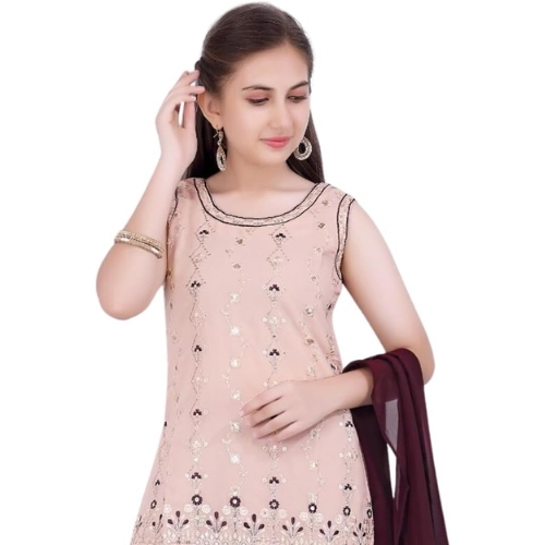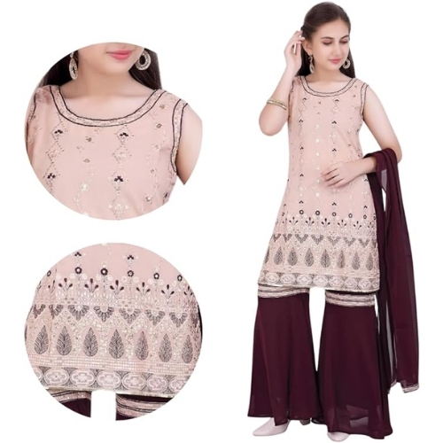 This beautiful mint green embroidered sharara set from Traditional Threads is perfect for any special occasion. The kurta features intricate gota and mirror embroidery on a light and airy organza base that will keep the wearer cool and comfortable. Pairing it with the Maroon sharara pants and net dupatta creates an elegant and flowing look. The embroidery work adds gorgeous detail that will surely be admired. This kids set comes in a breathable fabric and loose fit that allows freedom of movement for playing. The pretty mint green hue makes it a lovely option to wear year-round. A thoughtful gift, it will be treasured for festivals and celebrations to come. Hand wash is recommended for care.