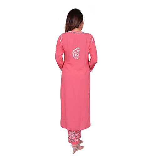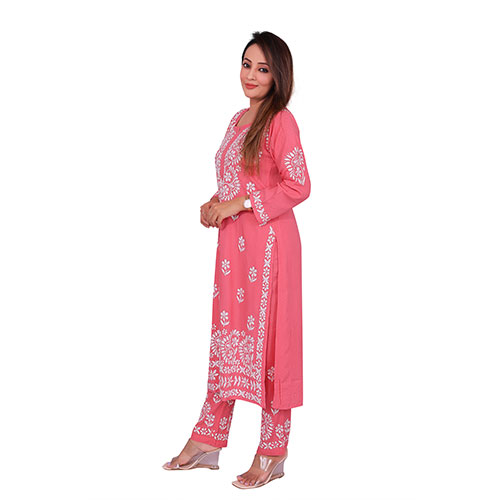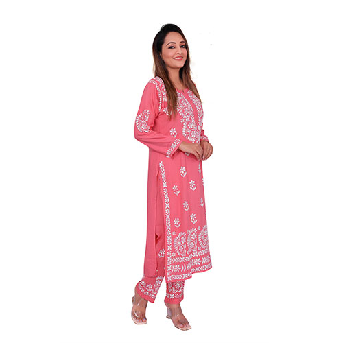 Embrace the timeless elegance of Indian craftsmanship with this exquisite light pink chikan kurti and plazzo co-od from Traditional Threads. Tailored to perfection from premium quality fabric, it promises a soft and soothing touch against your skin. The round neck adds a touch of sophistication, while the full sleeves offer a modest yet stylish look. The intricate chikankari embroidery, a traditional art form from Lucknow, elevates this kurti to an unparalleled level of beauty. With a regular fit and calf length, it strikes the perfect balance between comfort and style. Whether you're attending a festive occasion or simply seeking a touch of elegance in your everyday attire, this coral kurti is sure to fetch you compliments from all. Please note that the size may vary, so it's advisable to check the size guide before ordering. Hand washing is recommended to preserve the intricate embroidery and maintain the vibrant color.